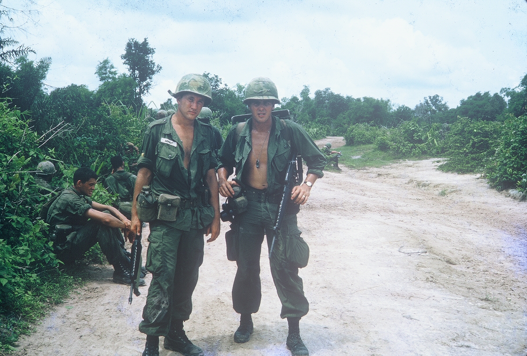 SGT Bill Franklin on right, SP4 Don Arndt on left on break near near HO BO Woods.